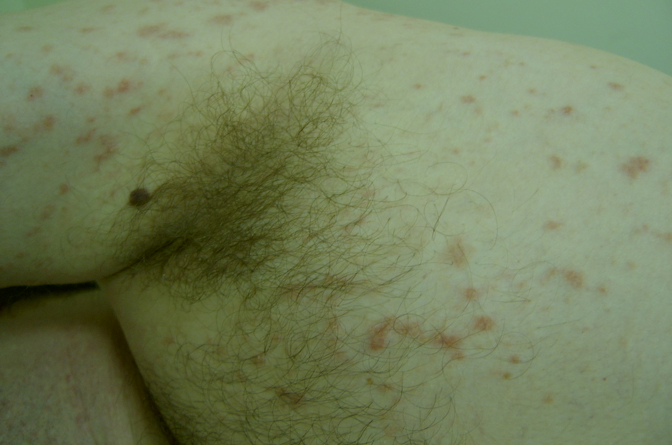Commonly affected sites are the wrists or between the fingers and toes, wrists, elbows, knees and buttocks, the penis and scrotum. On the penis, because the skin is loose and soft, the burrows become small raised scabs, especially when scratched.