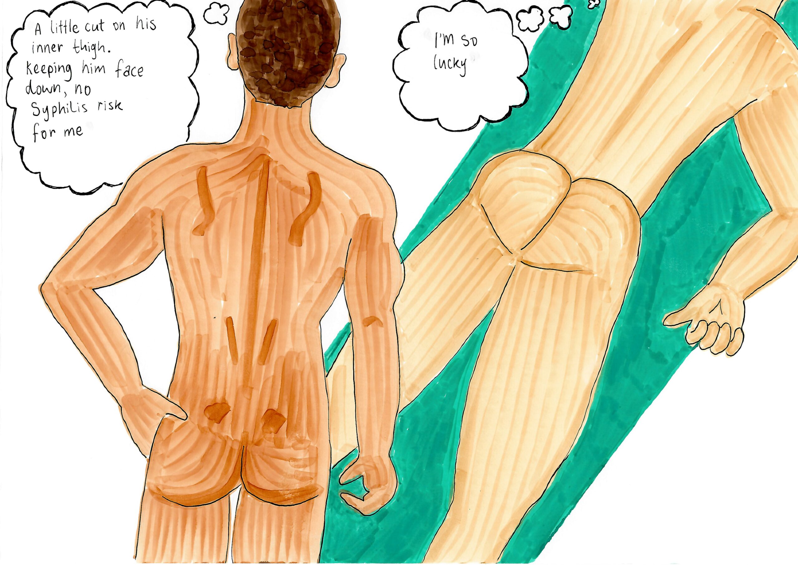 Most sex workers are not currently familiar with Syphilis. It’s easy to overlook or ignore the symptoms of Primary Syphilis. Basically, it is hard to determine whether it is a symptom, or just a small cut or skin tag. Play it safe by using bandaids, washing hands, using towels and doing face-down massage and/or body slides. Sex workers are actually the only people using an STI visual screen—keep at it and you will gain confidence.