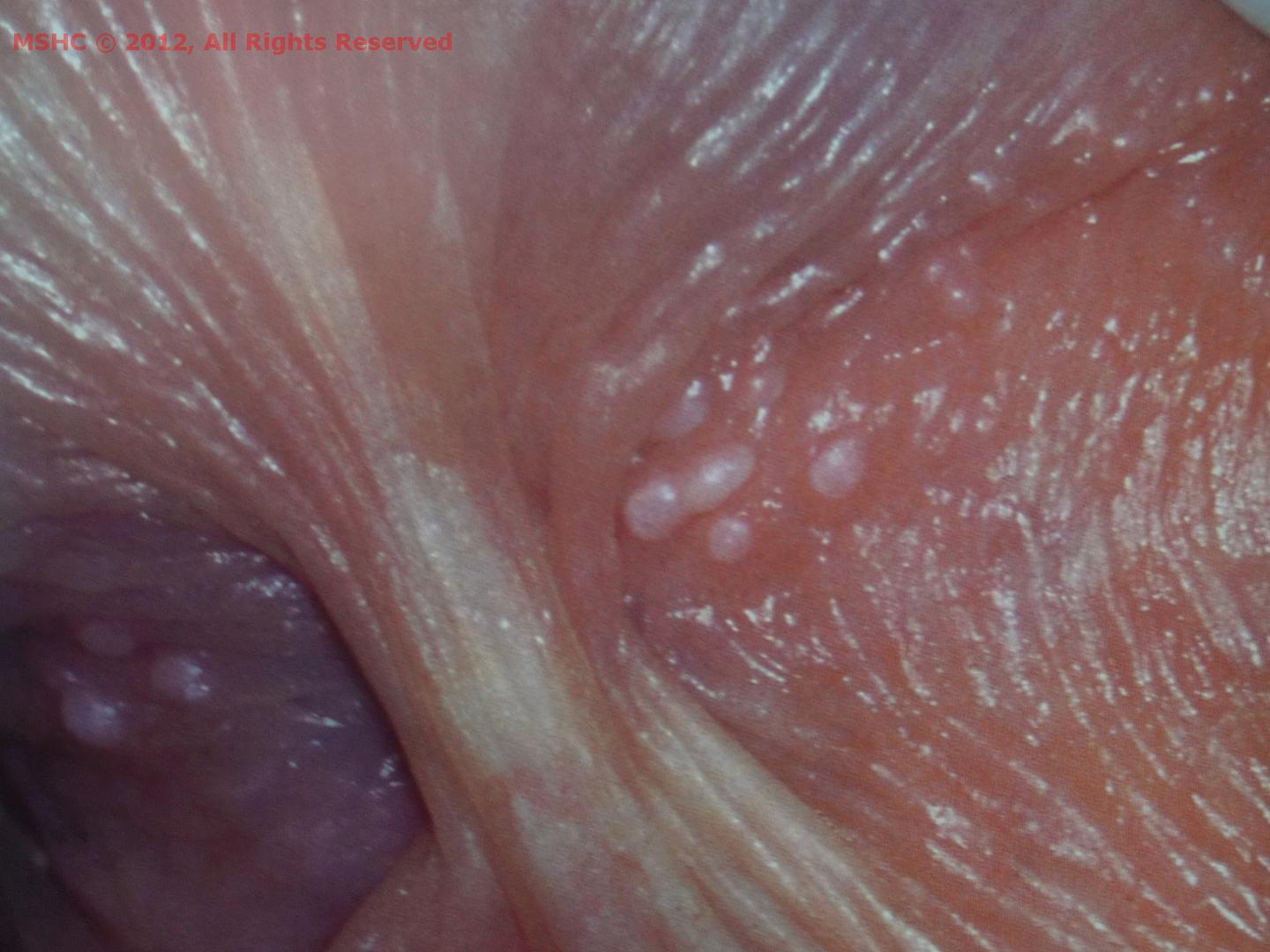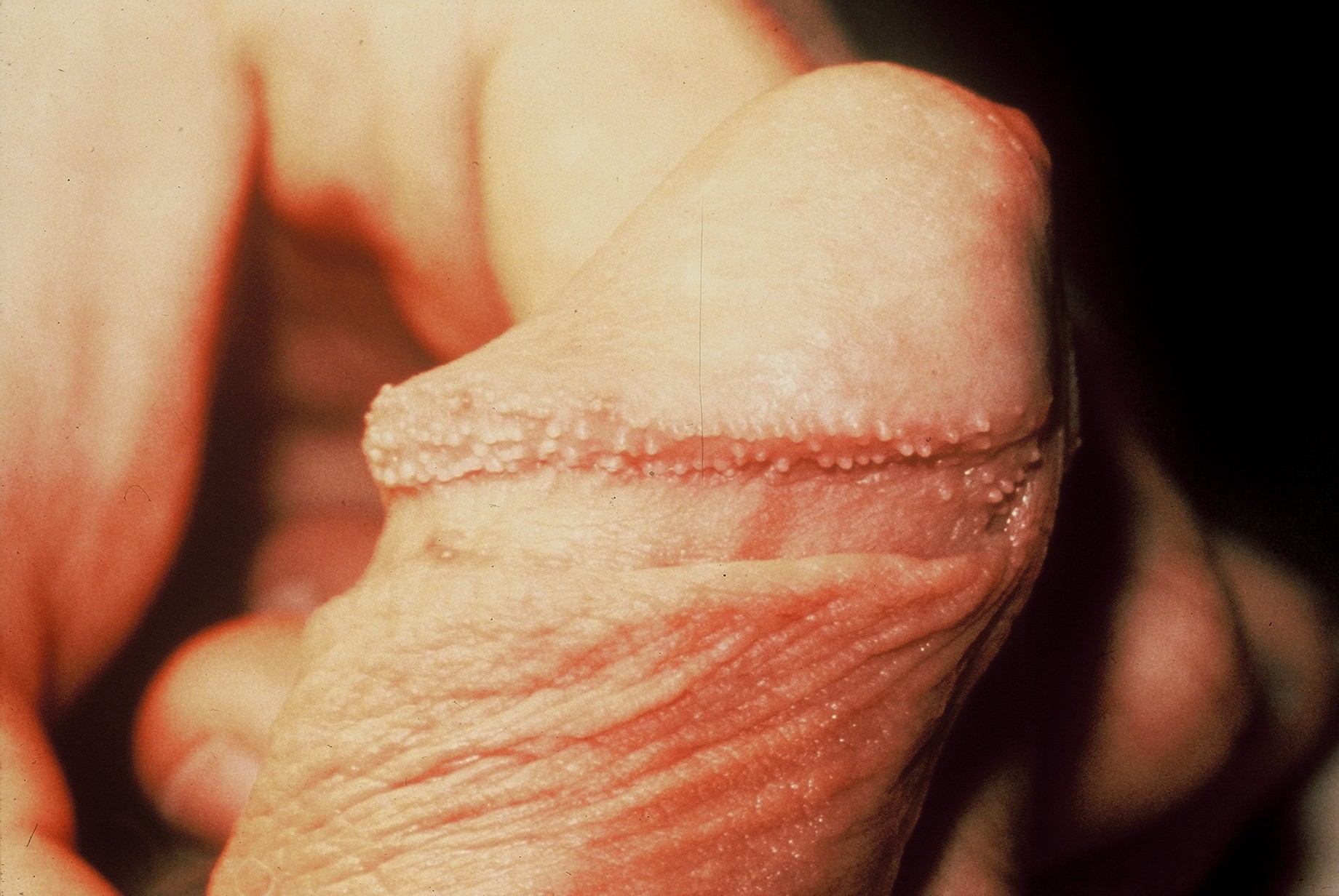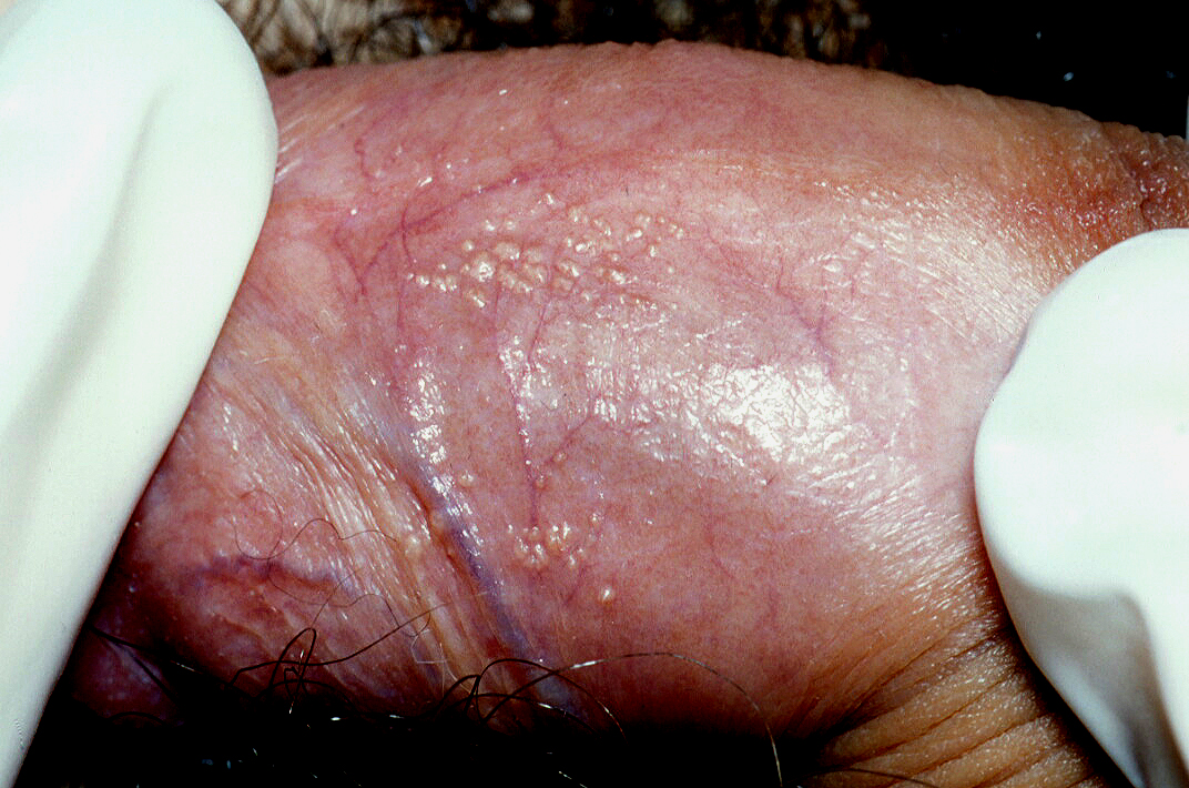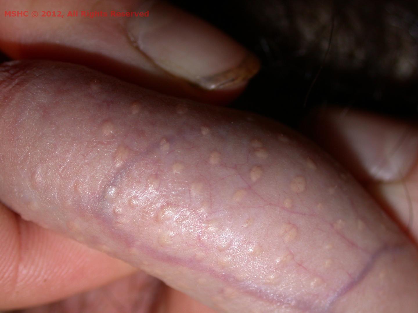 A good way to tell pearly papules from warts is that warts are usually hard and scattered over the anus and genitals, with no apparent pattern or uniformity, but pearly papules generally sit in regular, almost straight, lines in a ring around the widest part of the head of the penis. It’s highly unlikely that warts would appear in a similar pattern.
