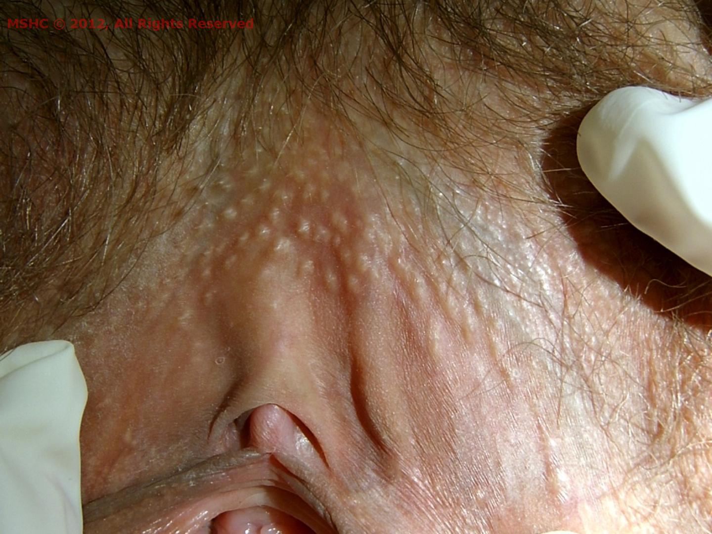 Fordyce spots are in genital glands. They look like very small white dots or lumps that are evenly spread just under the skin of the vulva and the penis (particularly when skin is stretched). In some people they are more visible than others.